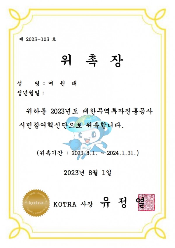Letter of Appointment of KOTRA Citizen Participation Innovation Group 관련링크 mondereve 818 0 본문 Letter of Appointment of KOTRA Citizen Participation Innovation Group SHARE THIS PAGE 목록